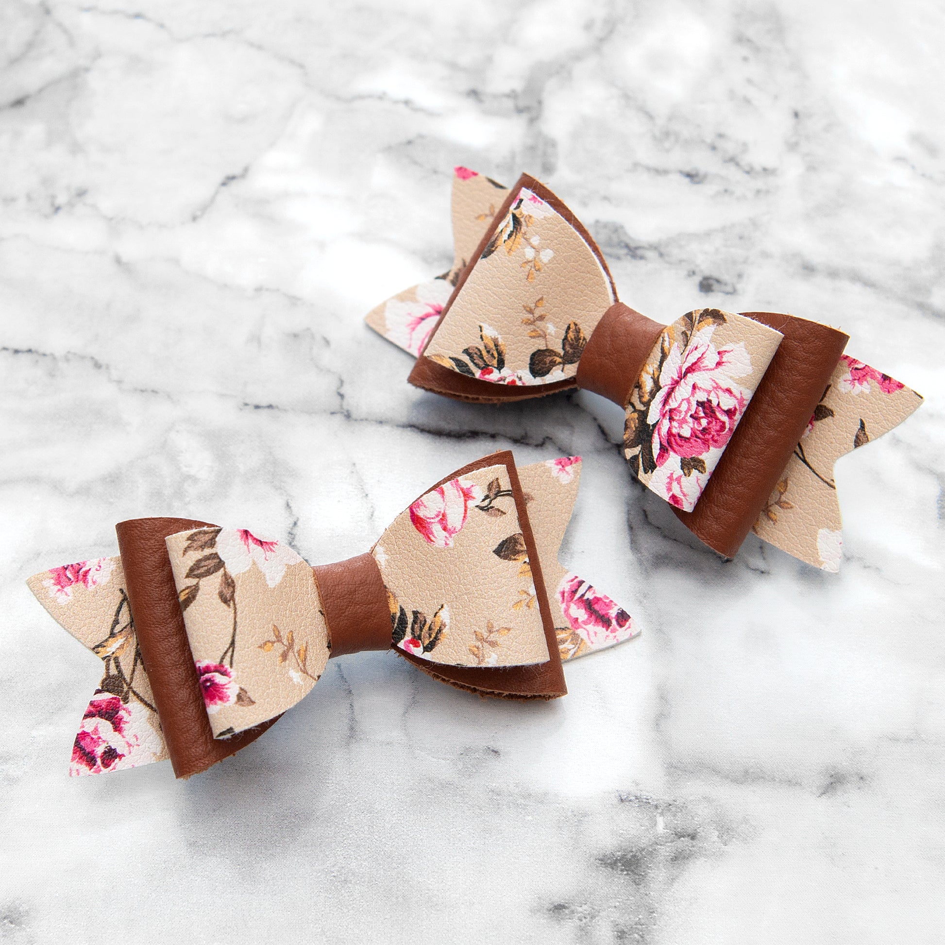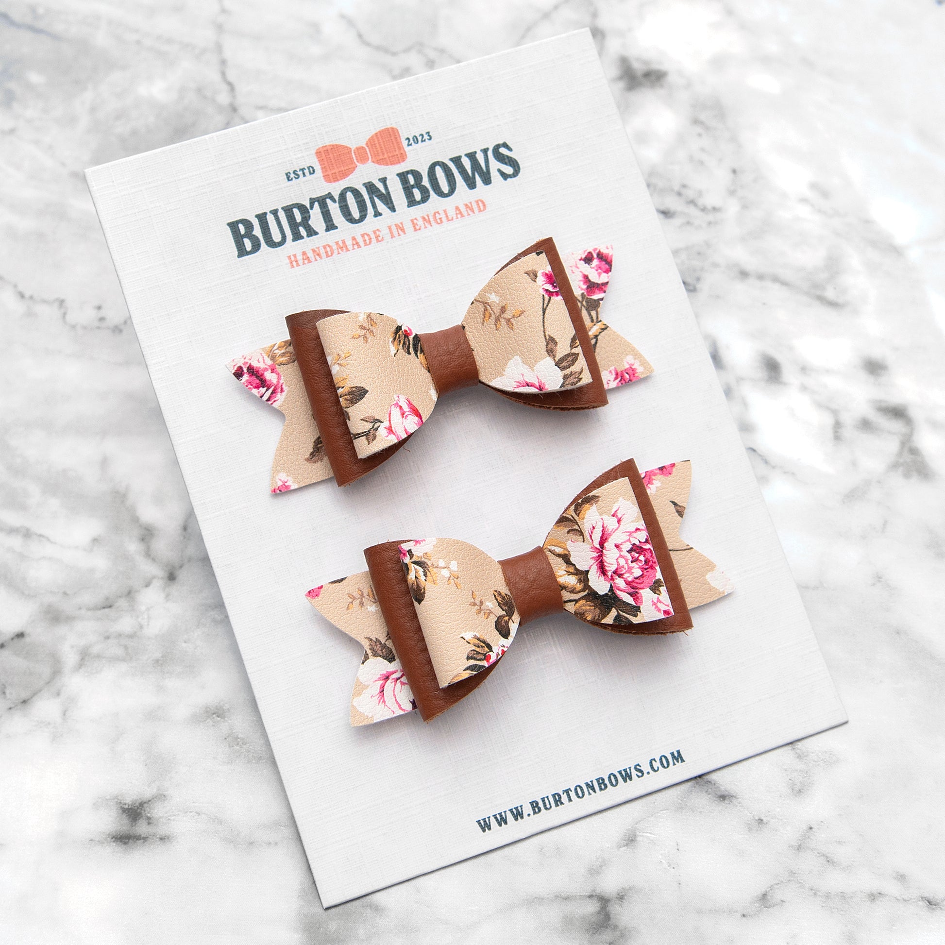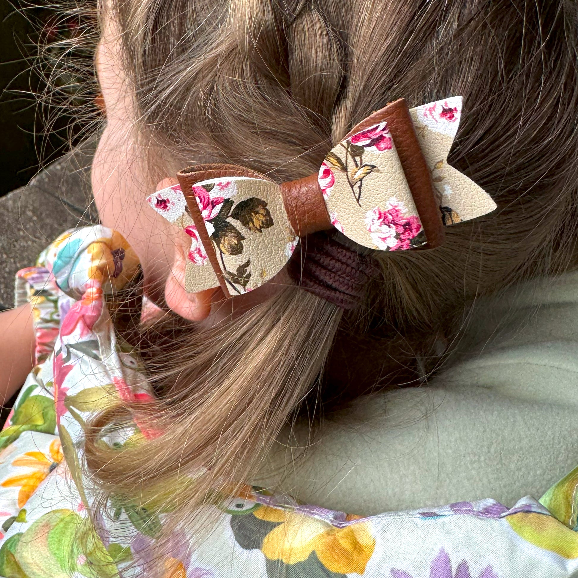 Let her bloom with our vintage rose floral print and tan leather hair bow! This charming girl's hair clip brings together soft floral vibes with a touch of tan leather for a fun yet timeless look. Whether she’s twirling at a party or just enjoying the day, this bow adds a sweet, vintage-inspired touch to any outfit and it's made in England!